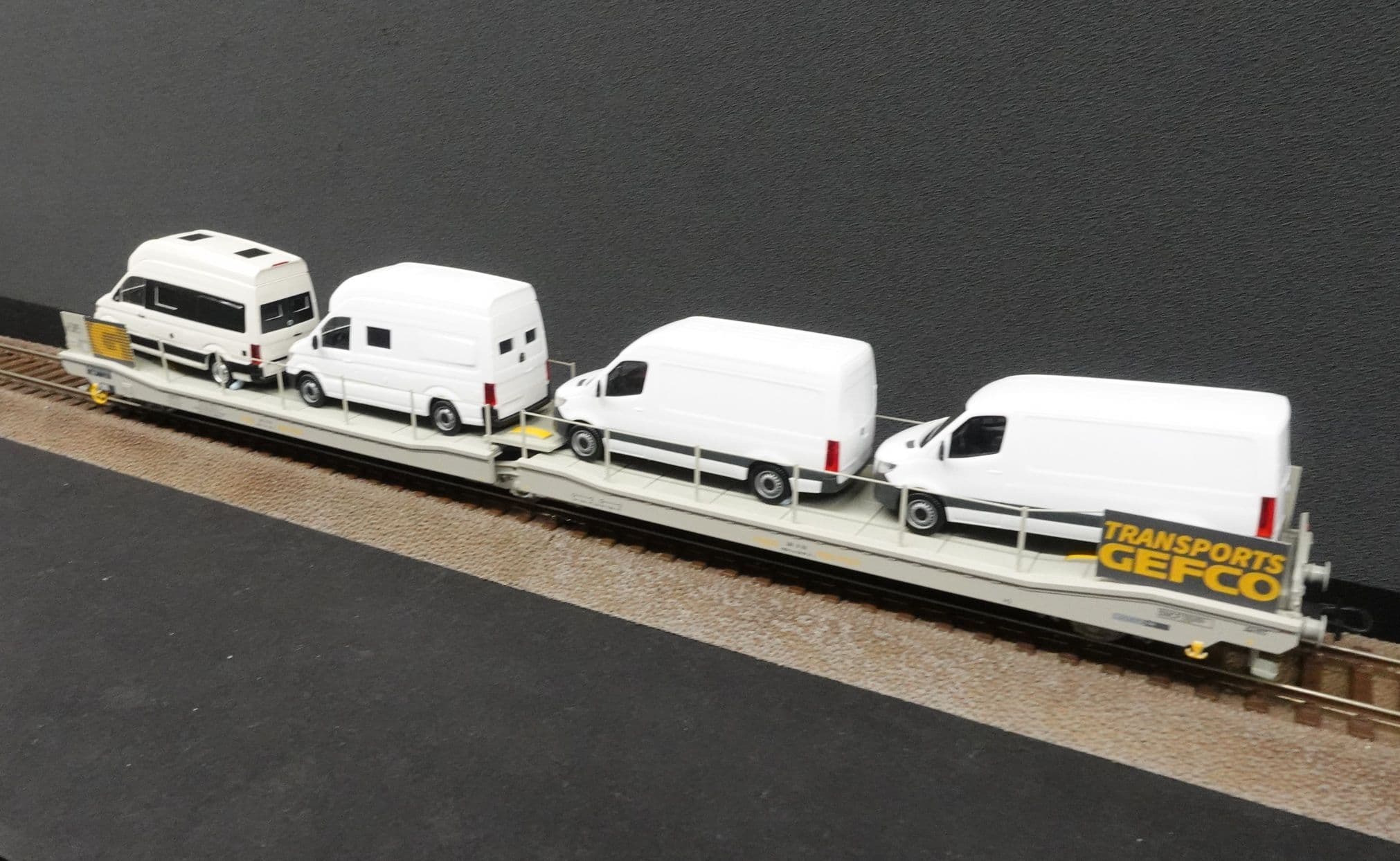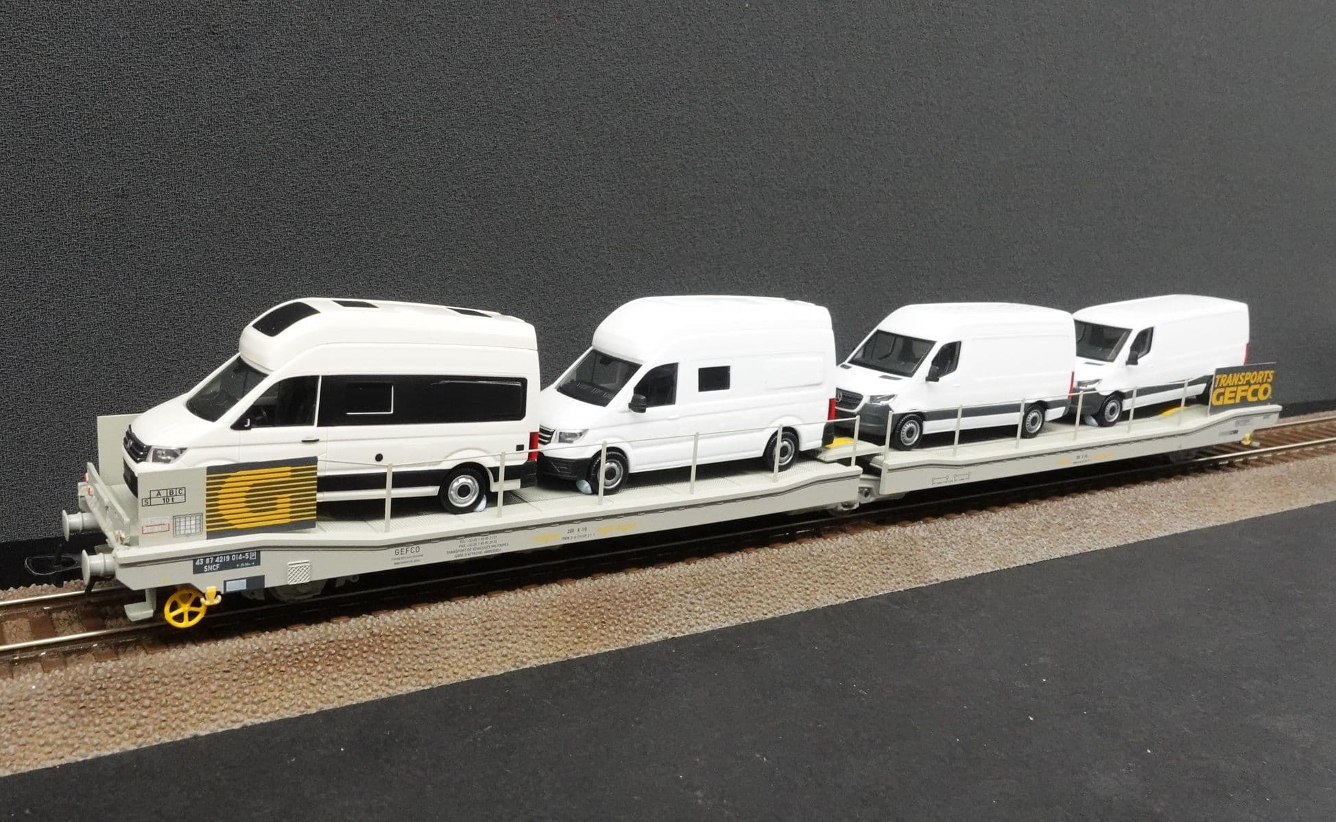 Jouef  HJ6208 GEFCO Ladks 3 Axle Flat Wagon loaded with 4 Herpa Commercial vehicles EpIV  HO