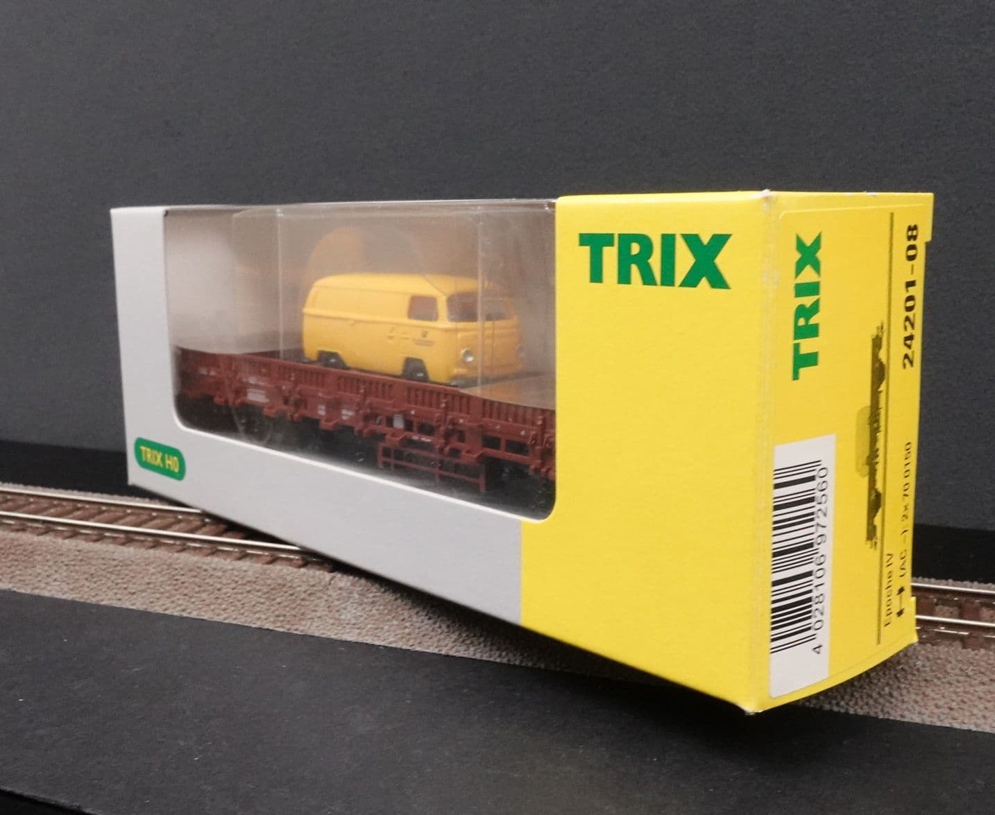 Trix 24201-08 DB Type Kls 443 Low sided wagon with Postal VW T2 van (Wiking model) .  Epoch IV  HO