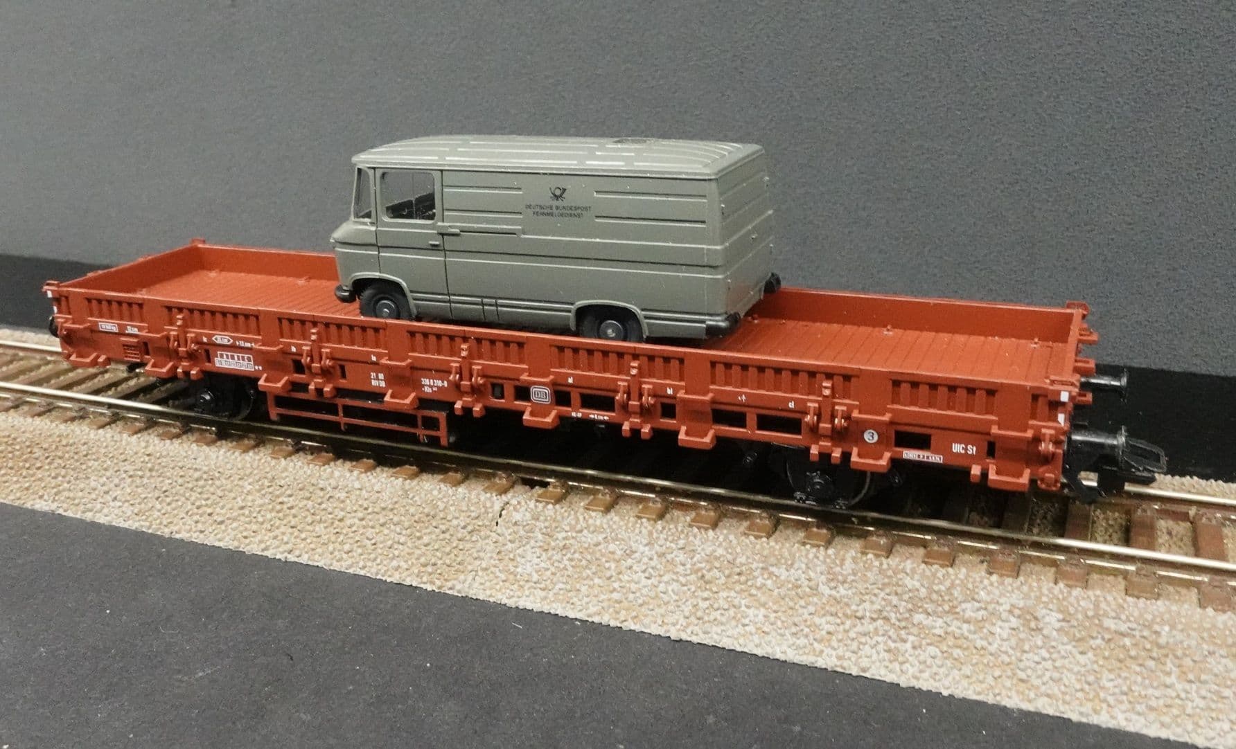 Trix 24201-12 DB Type Kls 443 Low sided wagon with Postal Mercedes L309 van (Wiking model) .  Epoch IV  HO